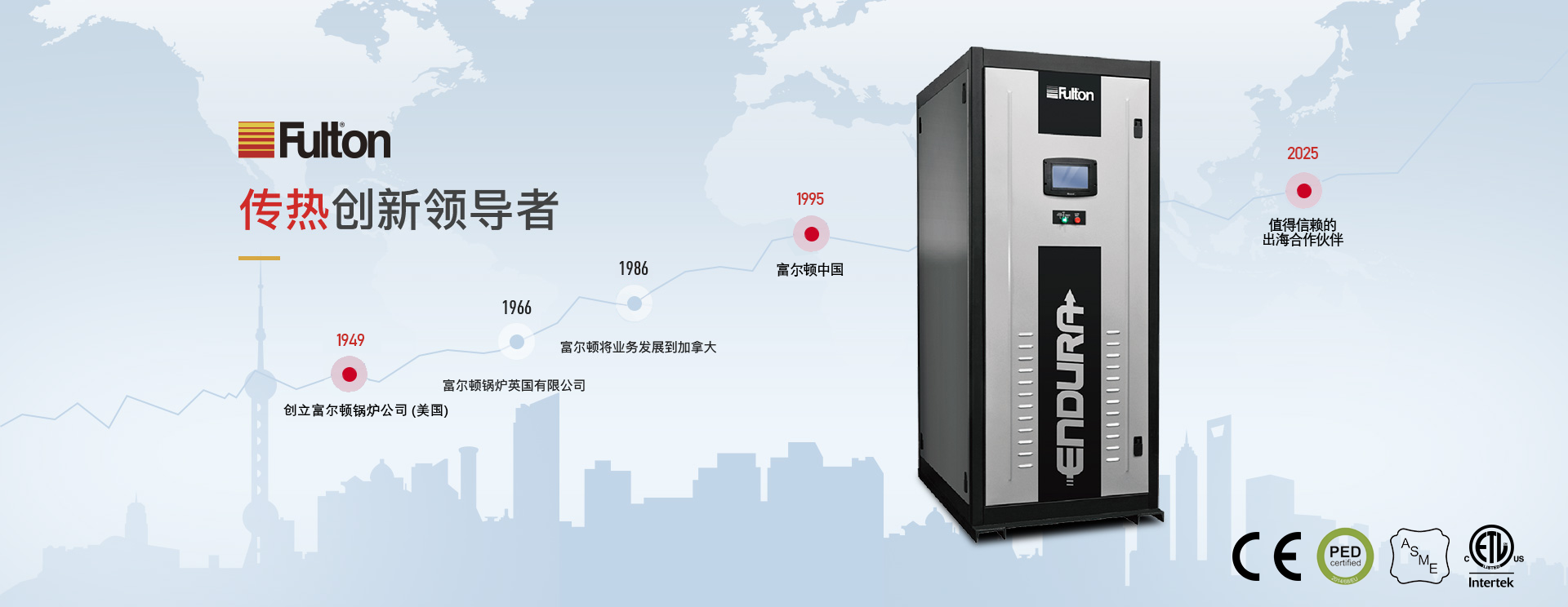 富爾頓是國際著名的跨國高質量傳熱產品制造商,具有七十多年的專業(yè)設計、制造、銷售鍋爐的經驗,是立式無管鍋爐和脈沖燃燒鍋爐的發(fā)明者,幾十年來一直領導世界鍋爐新潮流。